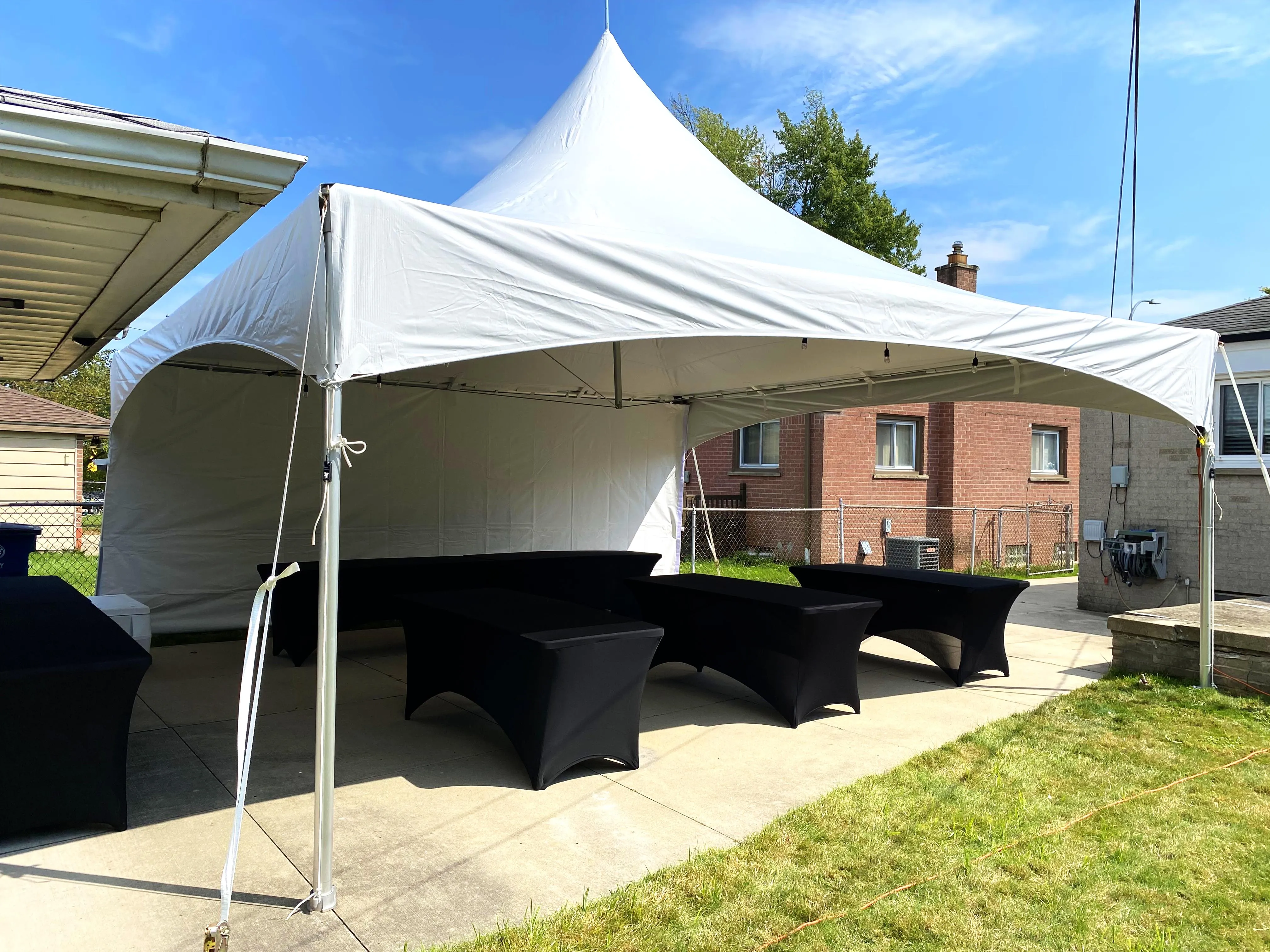 Elevate your event with our 20x20 High Peak Marquee Tent. Featuring a sleek, elegant design with a high peak for added height and space. Perfect for any occasion, it provides ample shelter and a sophisticated look for Graduations, Weddings and more. Durable, weather-resistant, and easy to set up, it’s the ideal choice for a stylish and functional event space.